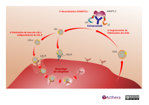 L’évinacumab est un anticorps monoclonal humain recombinant, qui se lie spécifiquement à l’ANGPTL3 et l’inhibe. L’ANGPTL3 fait partie de la famille des protéines de type angiopoïétine qui s’exprime principalement dans le foie et joue un rôle dans la régulation du métabolisme des lipides en inhibant la lipoprotéine lipase (LPL) et la lipase endothéliale (LE). Le blocage de l’ANGPTL3 par l’évinacumab abaisse les taux de TG et de HDL-C en libérant respectivement les activités de la LPL et de la LE de l’inhibition de l’ANGPTL3. L’évinacumab réduit le LDL-C indépendamment de la présence du récepteur des LDL (LDLR) en favorisant le traitement des lipoprotéines de très basse densité (VLDL) et la clairance des restes de VLDL en amont de la formation des LDL par un mécanisme dépendant de la LE.