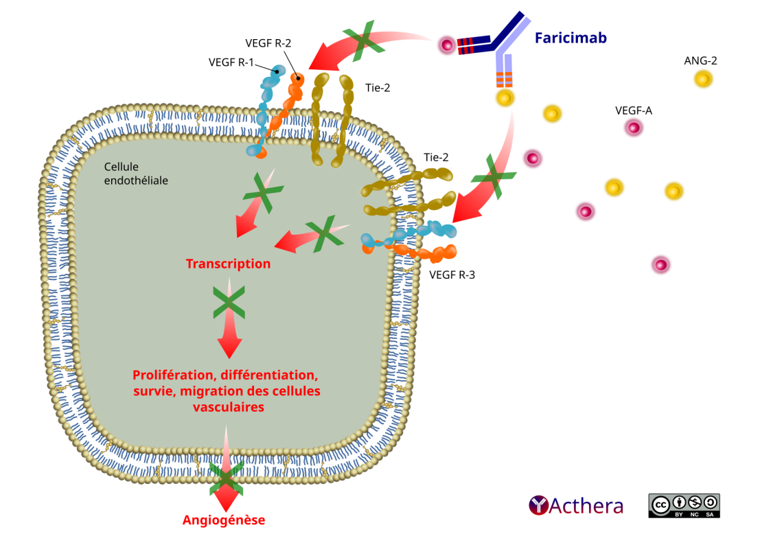 L’Ang-2 provoque une instabilité vasculaire en favorisant la déstabilisation endothéliale, la perte de péricytes et l’angiogenèse pathologique, potentialisant ainsi les fuites vasculaires et l’inflammation. Elle sensibilise également les vaisseaux sanguins à l’action du VEGF-A, ce qui entraîne une déstabilisation vasculaire supplémentaire. L’Ang-2 et le VEGF-A augmentent de manière synergique la perméabilité vasculaire et stimulent la néovascularisation. Par la double inhibition de l’Ang-2 et du VEGF-A, le faricimab réduit la perméabilité vasculaire et l’inflammation, inhibe l’angiogenèse pathologique et rétablit la stabilité vasculaire