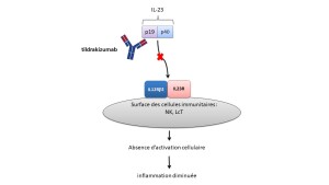 Le tildrakizumab se lie de manière spécifique à la sous-unité protéique p19 de la cytokine interleukine-23 (IL-23), sans se lier à l'IL-12, et inhibe son interaction avec le récepteur de l'IL-23. L'IL-23 est une cytokine naturellement produite, impliquée dans les réponses inflammatoire et immunitaire. Le tildrakizumab inhibe la libération des cytokines pro-inflammatoires et des chimiokines.